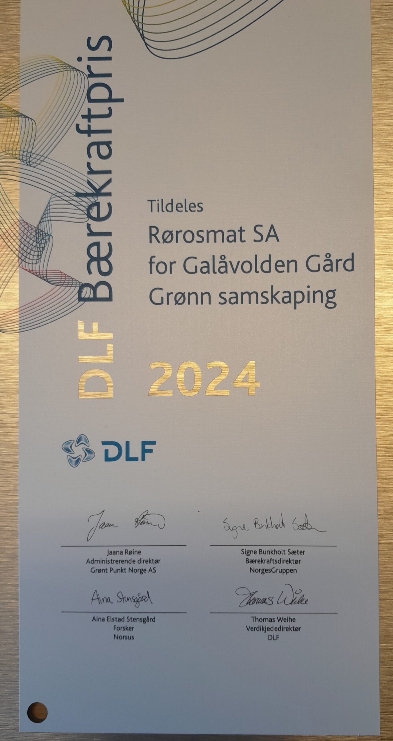 - Daglivareleverandørenes forening: DLF Bærekraftspris 2024 tildelt Rørosmat for Galåvolden Gård Grønn Samskaping.